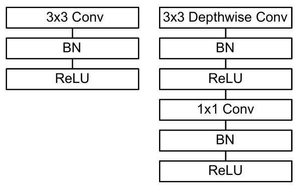 传统结构(左)搭配了DW卷积和PW卷积的深度可分离卷积基本结构(右)